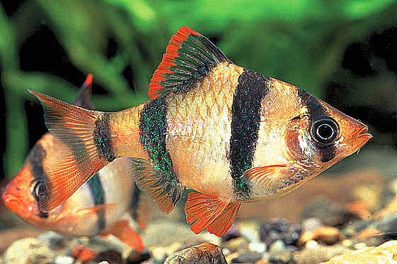 Beschreibung von Barbus tetrazona Die Sumatrabarbe Barbus tetrazona ist eine farblich äußerst attraktive Art, die mit ihren verschiedenen Zuchtformen zum Standardsortiment jedes Zoofachgeschäftes gehört. Der äußerst lebhafte und problemlos zu pflegende Schwarmfisch, der sein auffälliges Farbkleid schon als Jungtier trägt, sollte in Gruppen von mind. 5 Tieren gehalten werden. Für die ständig aktiven Tiere sollte genügend Schwimmraum vorhanden sein. Allgemeine Hälterungsbedingungen Barbus tetrazona ist ein Allesfresser, der sich gierig auf jedes Futter stürzt. Nach der Fütterung mit Trockenfutter ist zu beobachten, dass Tiere Probleme haben, die Wasseroberfläche zu verlassen: sie haben beim gierigen Fressen Luftbläschen aufgenommen, die erst wieder ausgestoßen werden müssen. Weicher Bodengrund (Sand mit Mulmschicht) ist zu empfehlen. Randbepflanzung mit harten Arten, dazwischen viel freien Schwimmraum. Eine Vergesellschaftung mit ruhigen Arten ist nicht zu empfehlen; auch ist von einem Zusammensetzen mit langflossigen Arten wie Skalare, Guppys oder Fadenfischen abzuraten, da ausgezogene Flossen angeknabbert werden können. Die Zucht, bei der ein Männchen mit mehreren Weibchen angesetzt werden kann, ist nicht sehr schwierig. Weiches und leicht saures Wasser ist notwendig. Männliche Tiere erkennt man zumeist an den kräftigeren Farben, wobei besonders die roten Säume der unpaaren Flossen auffallen. Auch die kräftig rot gefärbten Brustflossen der Männchen sind ein hilfreicher Hinweis zur Unterscheidung der Geschlechter. Allgemeine Gattungsinformationen In der Gattung Barbus